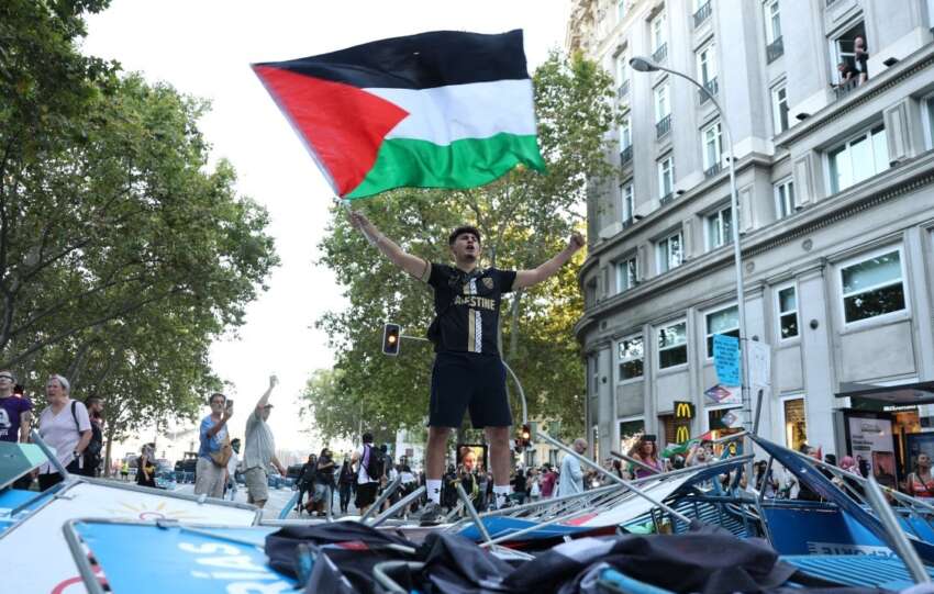 "¡Esta Vuelta, la gana Palestina!", gritaban exultantes los manifestantes propalestinos que este domingo impidieron que los ciclistas de la Vuelta a España llegaran a las calles de Madrid para la tradicional última etapa de la prueba.