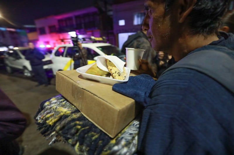 Durante la brigada se distribuyeron 300 tamales, cuatro galones de chocolate y café, 150 cobijas y 150 kits de alimentos, con el objetivo de reducir los riesgos asociados al frío nocturno y ofrecer apoyo inmediato a quienes pernoctan en la vía pública.