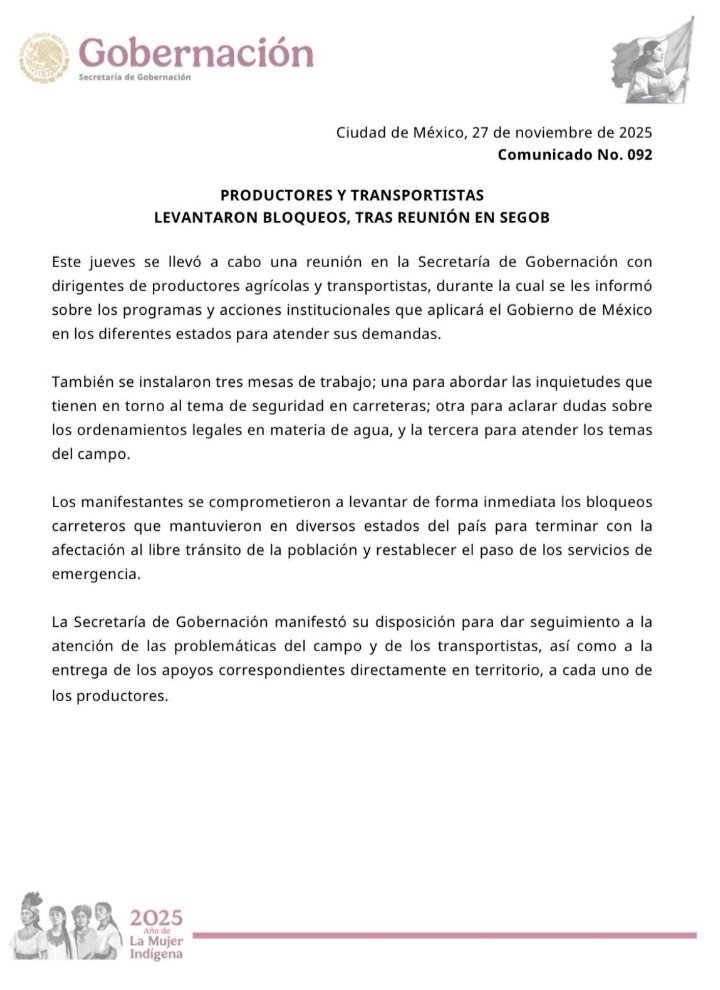GOBERNACIÓN ANUNCIA LEVANTAMIENTO DE BLOQUEOS CARRETEROS TRAS ACUERDOS CON PRODUCTORES Y TRANSPORTISTAS