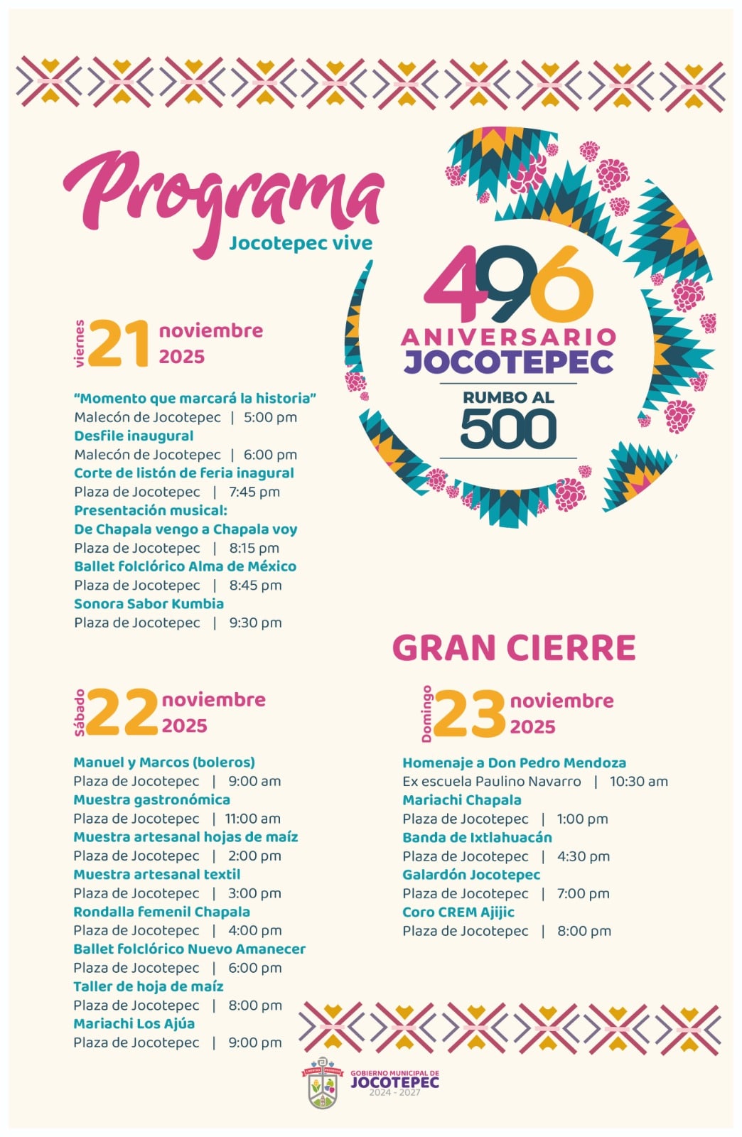 En rueda de prensa, el presidente municipal, David García Vargas, anunció que las celebraciones iniciarán el viernes 21 de noviembre, a las 17:00 horas, en el malecón de Jocotepec. Ahí se llevará a cabo un acto de identidad y resignificación, descrito por el alcalde como un espectáculo circense de primer nivel que “marcará un antes y un después en el municipio”.