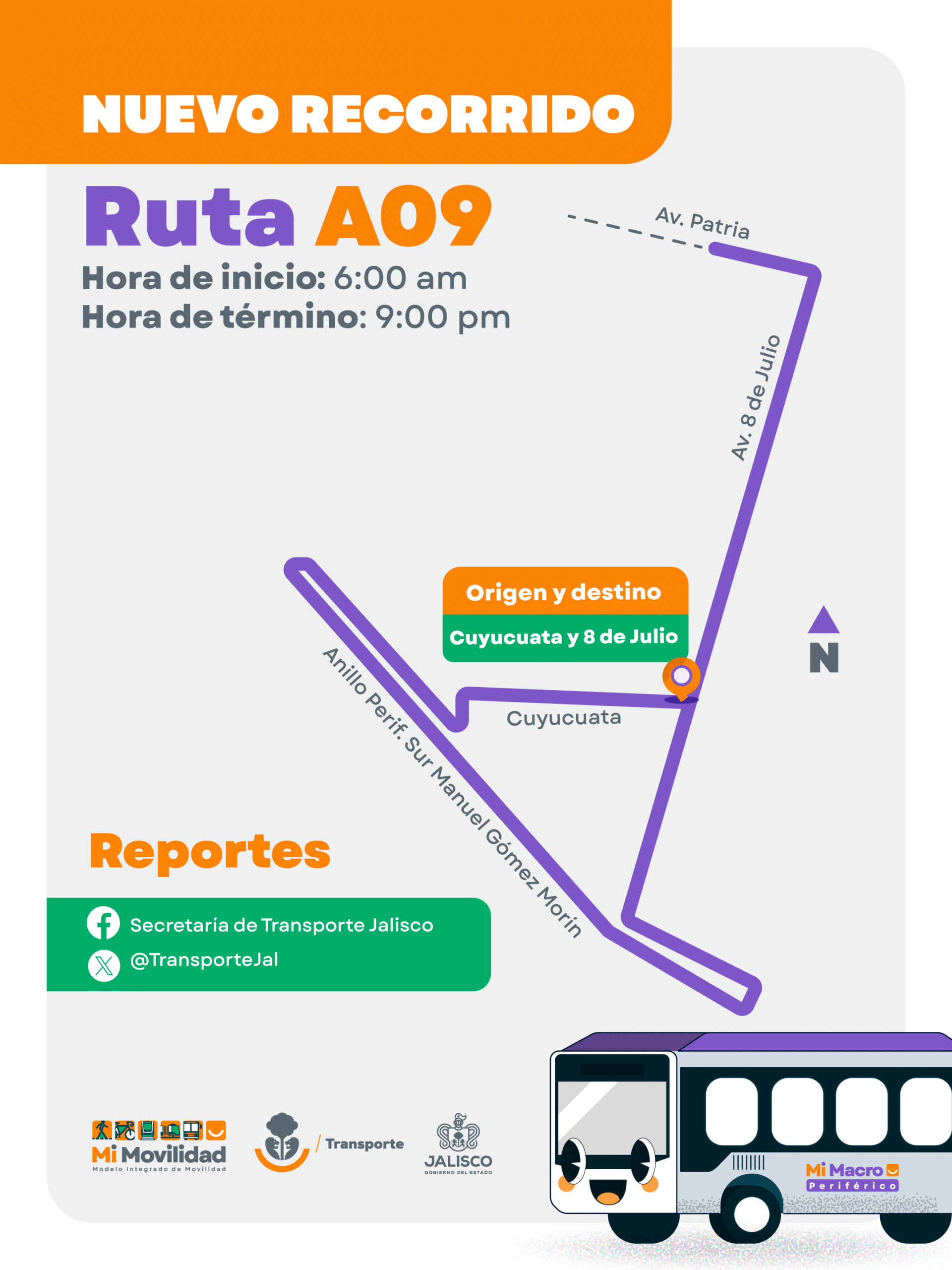 La Secretaría de Transporte informó que, en atención a solicitudes de vecinas y vecinos de Santa María Tequepexpan, se realizaron ajustes al proyecto de una estación de Mi Macro Periférico y se modificó el derrotero de la ruta A09. A partir del lunes 8 de diciembre, la A09 ampliará su recorrido de 15 a 17 kilómetros, con salida en Avenida 8 de Julio y Cuyucuata y destino en Avenida Patria, con un intervalo de paso de 15 minutos.