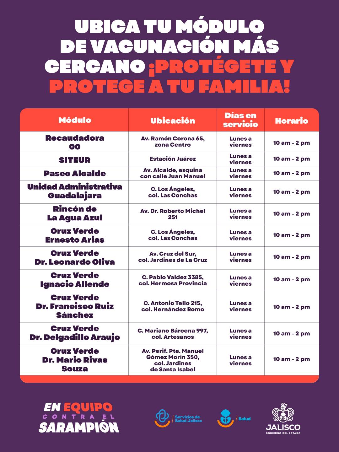 Las sedes, distribuidas en las Regiones Sanitarias 11 y 12, así como en Guadalajara, operan en plazas públicas, hospitales, oficinas municipales y unidades de la Cruz Verde, con horarios que van de las 9:00 a las 18:00 horas, según el punto de atención.
