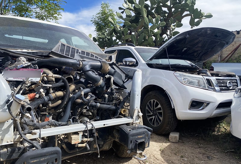 En total, fueron ubicadas diez camionetas —de dos solamente ya el chasis— todas remarcadas en sus números de serie: una Chirey Tiggo con reporte de robo, una Ford F-150 desmantelada, una Nissan Frontier, una Nissan Estacas, una Chevrolet Colorado, una Porsche, una Dodge Ram semidesmantelada, una Acura RDX, y el chasis de una Nissan Frontier y de una Chevrolet Silverado, este último con carpeta de investigación tras su robo denunciado en Lagos de Moreno.