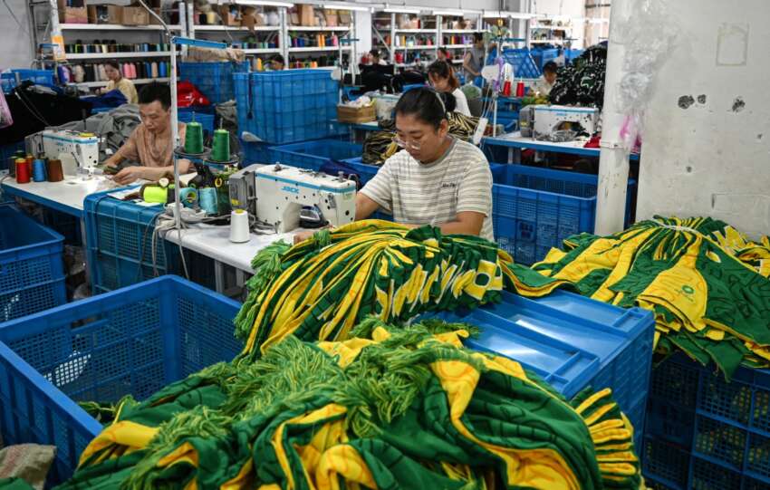 En una fábrica china repleta de bufandas con los colores de Irlanda o Tanzania, su director Shang Yabing lamenta que la incertidumbre en torno a los aranceles estadounidenses frene los pedidos de productos derivados para el Mundial de…