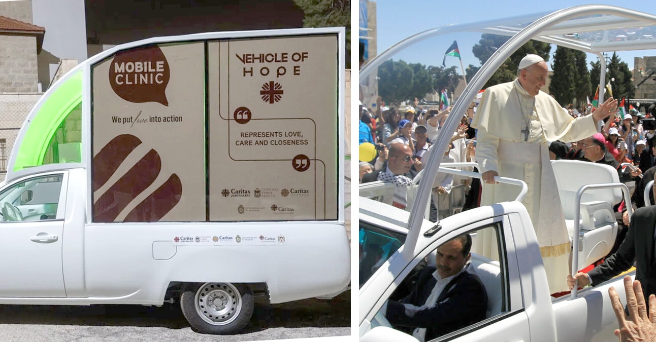 El papamóvil utilizado por el papa Francisco en su visita a Belén en 2014 fue presentado este martes tras ser adaptado como clínica itinerante para los niños de Gaza.